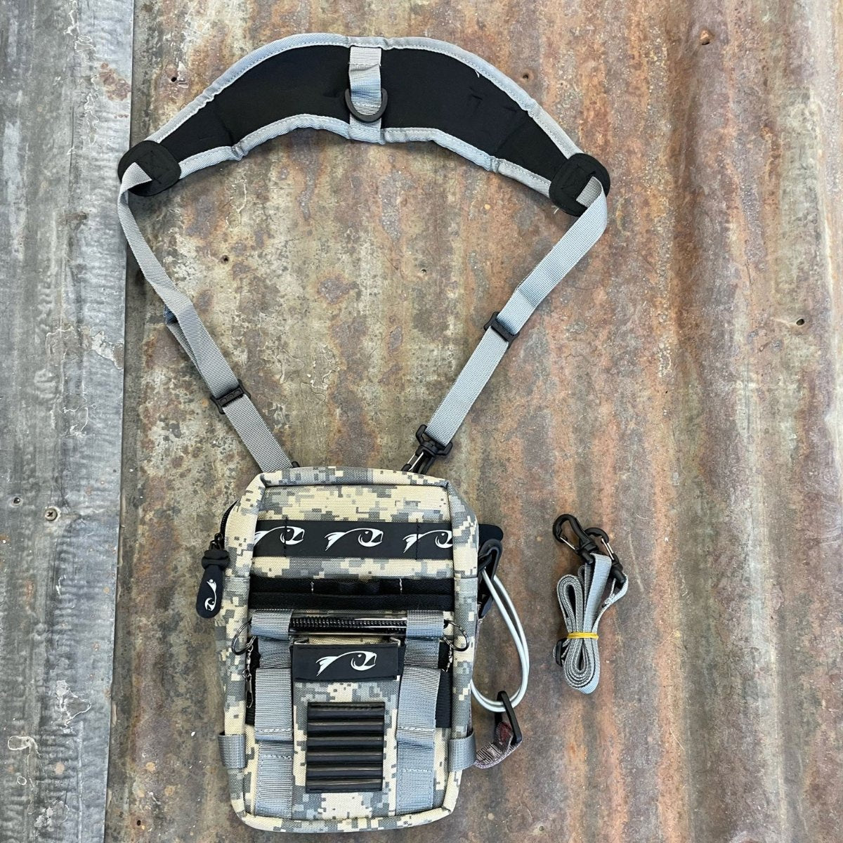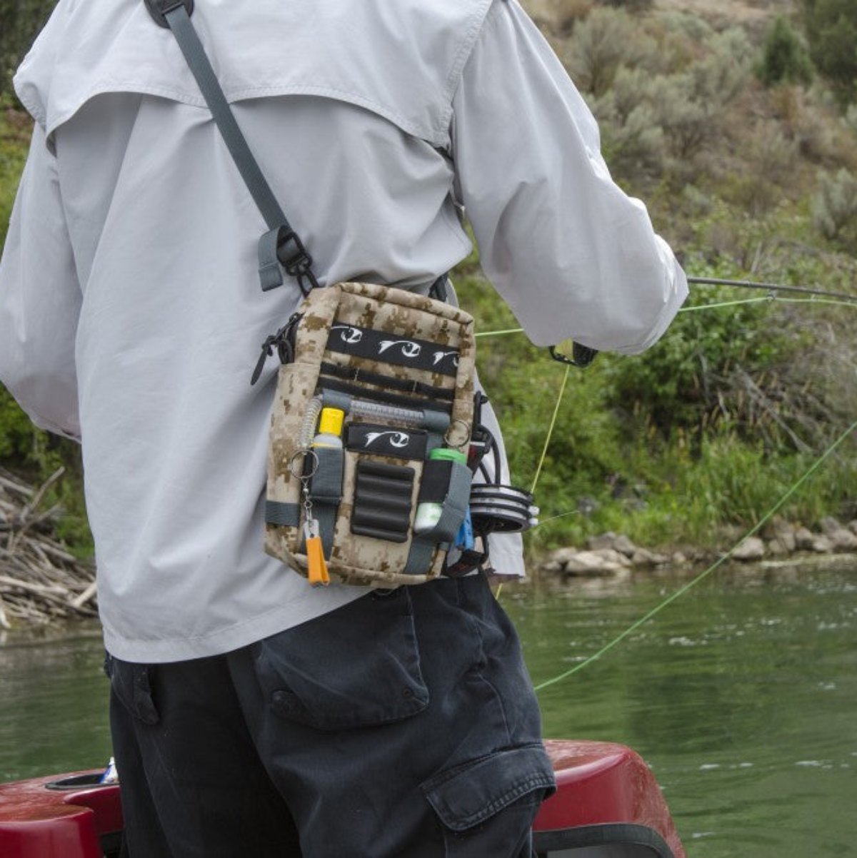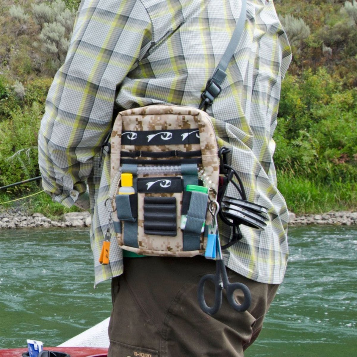 Here's how the Flask Pack came to be... years ago we were fishing with our good friend and fellow product perfectionist Mickey Anderson. One of us wore a chest pack from a prior employer, the other a leather lanyard we use to sell with a few fly boxes in shorts pockets. Mickey was sporting a small fanny pack that he had completely re-sewn into the ultimate pack for his Ninja-style tactical fishing. It was a decent day, we each hooked into nice fish in obvious areas, and then sat down and drank beer while Mickey pulled fish out of not only the same holes but also every possible holding water on the stretch. His custom modified pack didn't hurt that productivity. He didn't have to deal with a whole bottle of dry shake opening in a molded foam pocket, or fumble with a fly box in wet shorts that stuck to the plastic. Following this day, we told Mickey we'd produce a small pack if he'd work with us to perfect it. What you see is the result... aka The Flask Pack!